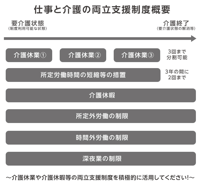 | 制度の内容 | 要介護状態にある対象家族を介護する場合、所定外労働を制限することを請求できます。 |