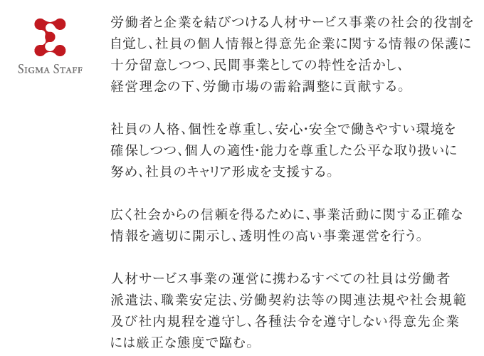 人材サービス事業の運営に携わるすべての社員は労働者派遣法、職業安定法、労働契約法等の関連法規や社会規範及び社内規程を遵守し、各種法令を遵守しない得意先企には厳正な態度で臨む。