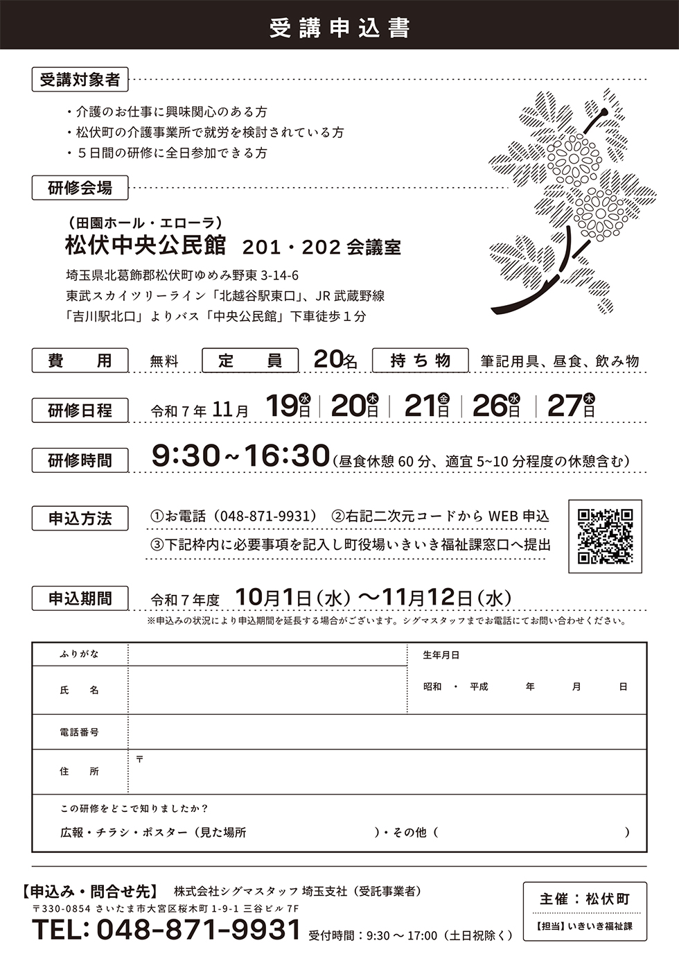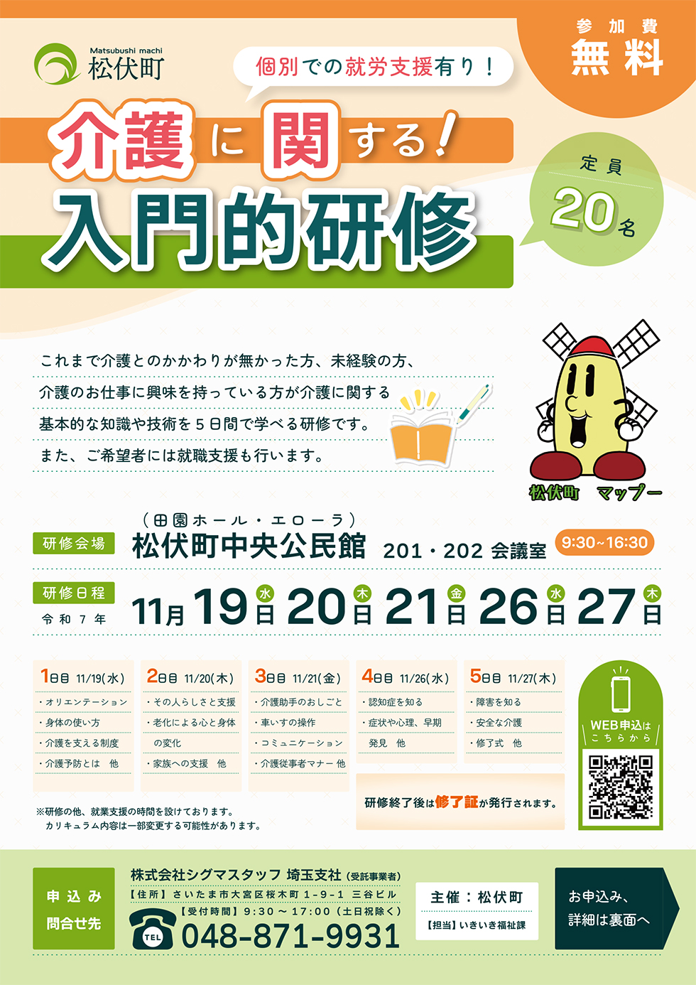 ※お問い合わせフォームの件名は「松伏町 介護に関する入門的研修」を選択してください。