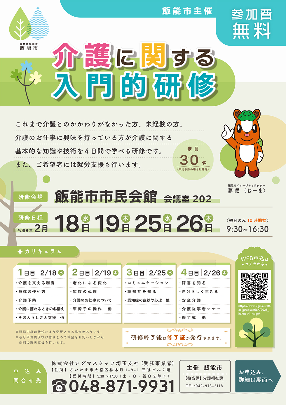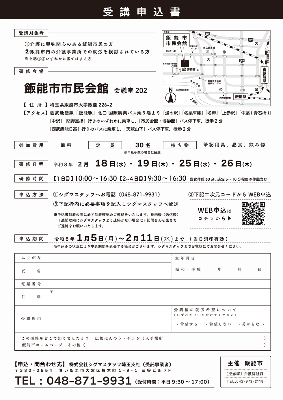 ※お問い合わせフォームの件名は「飯能市 介護に関する入門的研修」を選択してください。