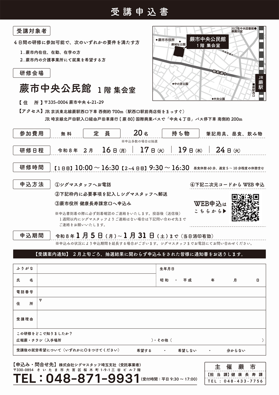 ※お問い合わせフォームの件名は「蕨市 介護に関する入門的研修」を選択してください。