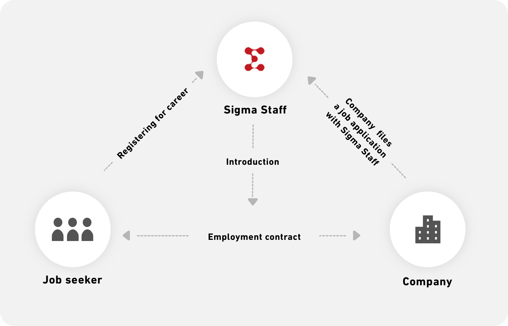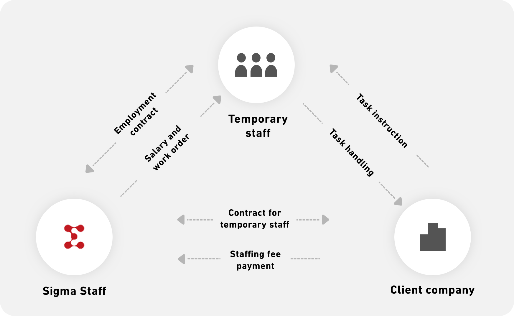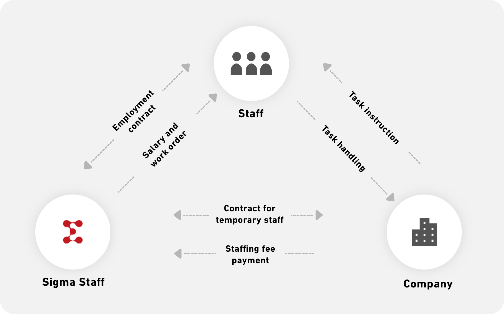 Three elements make up Sigma Staff Temporary Staff Services: staff (you), the dispatching agency (Sigma Staff), and client companies.